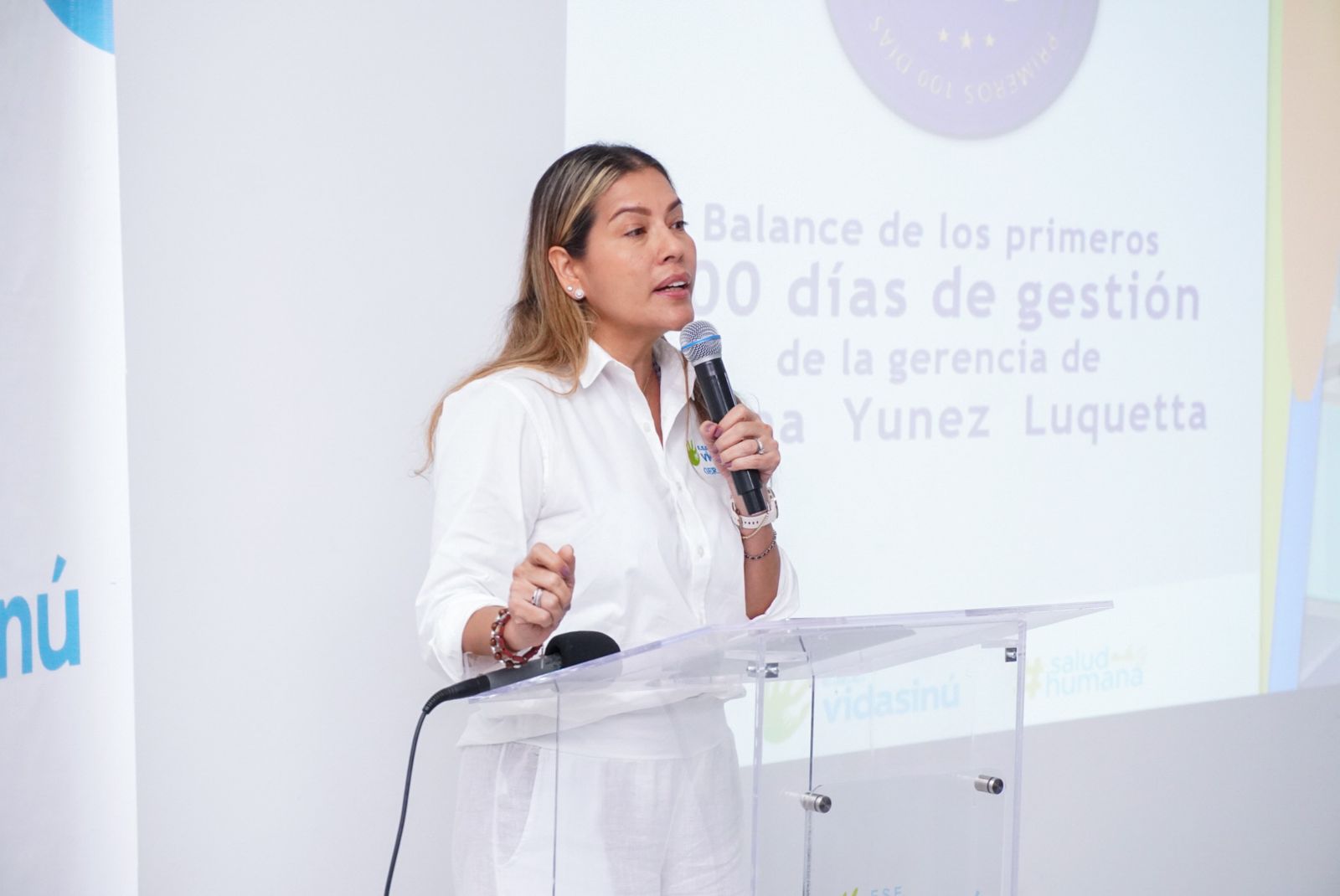Liliana Yúnez Luquetta, gerente de la E.S.E Vidasinú, entregó la mañana de este martes 13 de agosto un balance de los primeros 100 días de su gestión. En su presentación, destacó el apoyo del alcalde de Montería, Hugo Kerguelen, y del gerente de ciudad, quienes estuvieron presentes en la socialización.