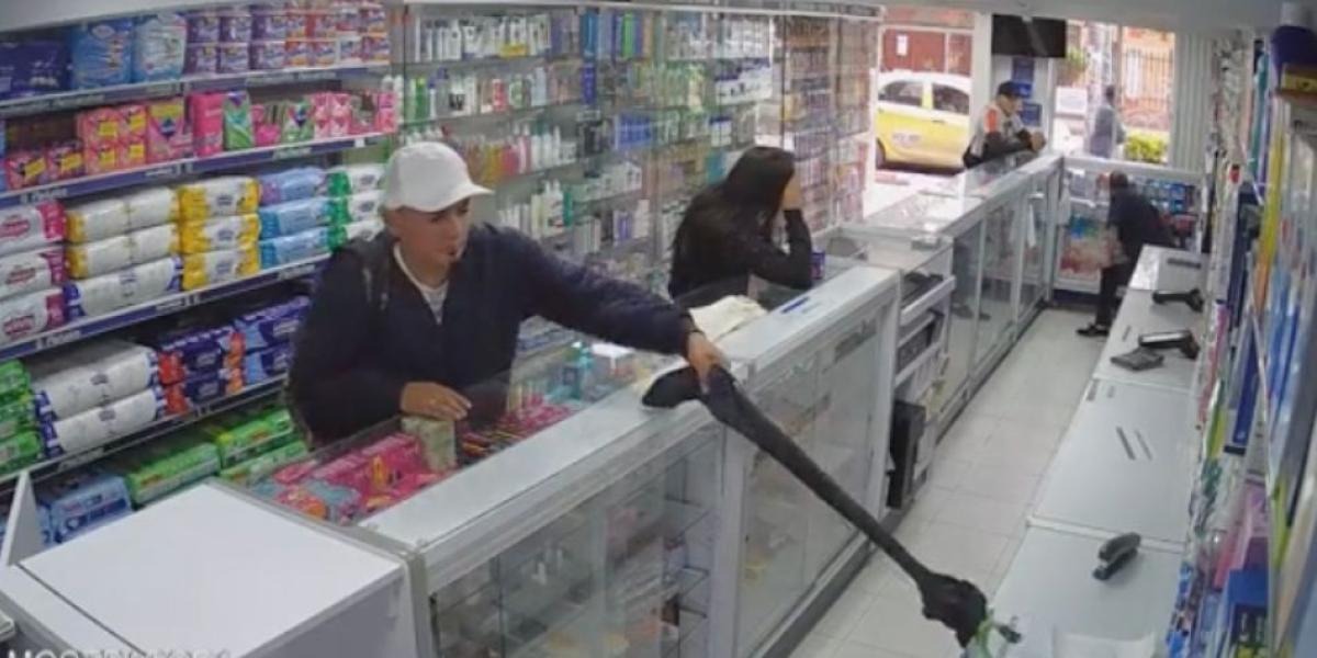 Una grabación de seguridad capturó el momento en el que, valiéndose de un brazo mecánico, un delincuente raptó un celular en una droguería en la ciudad de Bogotá.