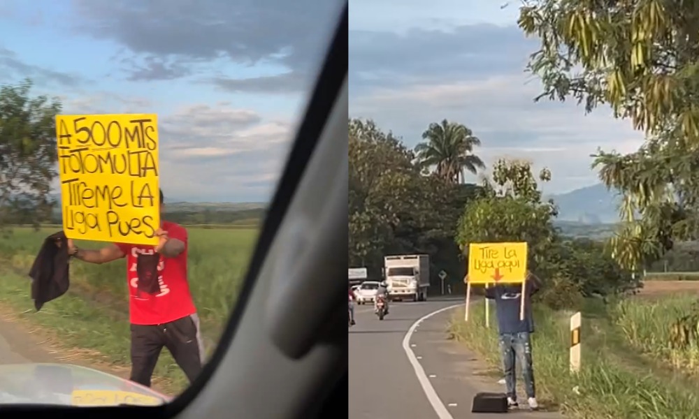 Un video que circula en redes sociales ha captado la atención de miles de usuarios al mostrar la ingeniosa forma de evitar las temidas fotomultas en carretera. En la grabación, se observa a un hombre parado a la orilla de una vía con un cartel que advierte: «a 500 mts fotomulta. Tíreme la liga pues».