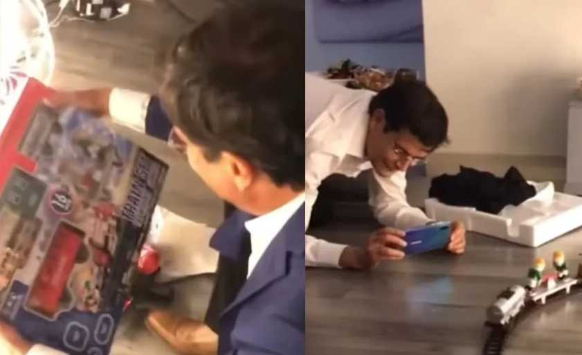 El video captura el instante en que el padre descubre el regalo bajo el árbol de Navidad. Al abrir el paquete y ver el tren en miniatura, su rostro se llena de alegría, reviviendo recuerdos de su infancia y emocionando a todos los presentes.