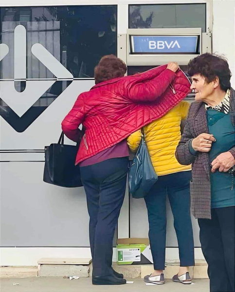Una fotografía que muestra a tres señoras tomando precauciones mientras retiraban dinero de un cajero automático del banco BBVA se ha vuelto viral en redes sociales.
