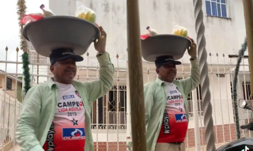 En el video, se puede ver al hombre transitando felizmente por las calles con un recipiente lleno de mangos sobre su cabeza, mientras canta la pegajosa melodía.