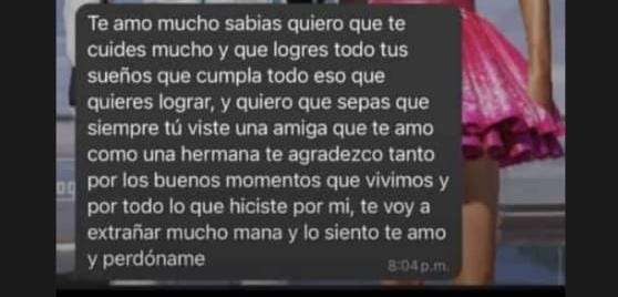 “Te amo mucho, sabias, quiero que te cuides mucho y que logres todos tus sueños, que cumpla todo eso que quieres lograr, y quiero que sepas que Siempre tú viste una amiga que te amó como una hermana, te agradezco tanto por los buenos momentos que vivimos y por todo lo que hiciste por mí, te voy a extrañar mucho mana y lo siento te amo y perdóname”.