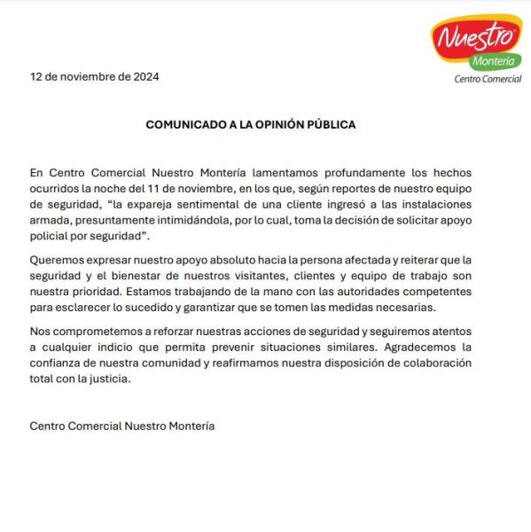 En Montería, los habitantes se alarmaron tras la noticia de que un hombre armado ingresó al Centro Comercial Nuestro con la intención de intimidar a su expareja sentimental, una cliente del establecimiento.