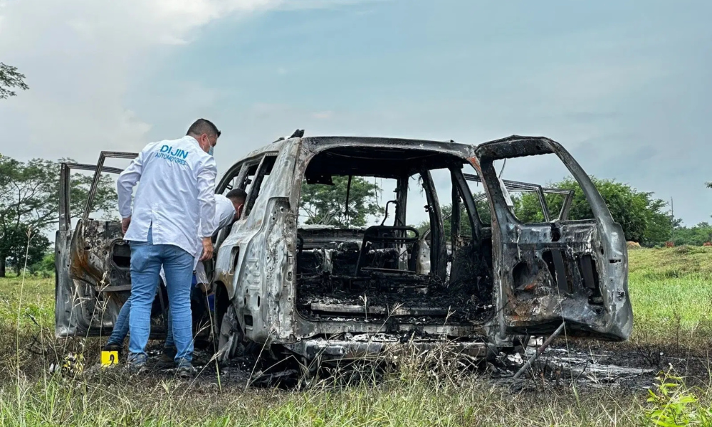 Fue así como la Policía llegó al sitio y halló la camioneta Toyota TXL de placas NDT-586 de Bogotá incinerada y dentro, en su parte trasera, los cuatro cadáveres.