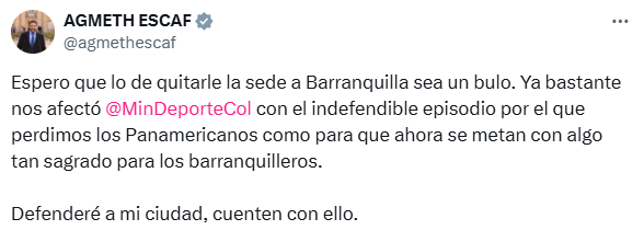 «Espero que lo de quitarle la sede a Barranquilla sea un bulo. Ya bastante nos afectó @MinDeporteCol con el indefendible episodio por el que perdimos los Panamericanos como para que ahora se metan con algo tan sagrado para los barranquilleros. Defenderé a mi ciudad, cuenten con ello», escribió Escaf en X.
