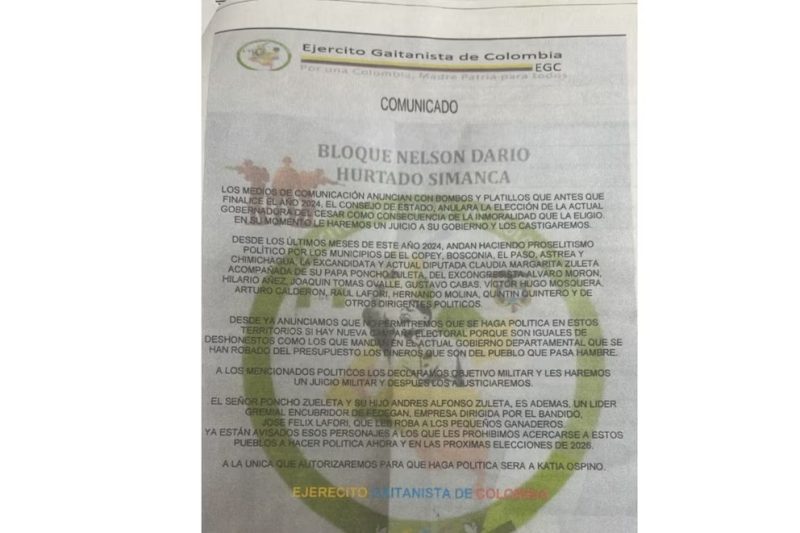 En el documento se afirma que en caso de que se confirme la anulación de la actual gobernadora del Cesar, el grupo armado no permitirá que se vuelvan a hacer eventos de campaña de algún posible comicio en la región.