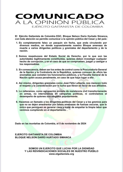 Sin embargo, tras ver que la situación estaba creando pánico entre los habitantes del departamento del Cesar, el Clan del Golfo sacó un comunicado en el que desmiente la situación, señalando que son una organización que respeta al Estado Social de Derecho.