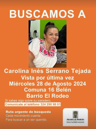 Según contó Valeria Molina Gómez, secretaria de las Mujeres de Medellín y compañera de Carolina Serrano, la mujer fue vista por última vez cuando se encontraba afuera de su casa en el barrio El Rodeo.