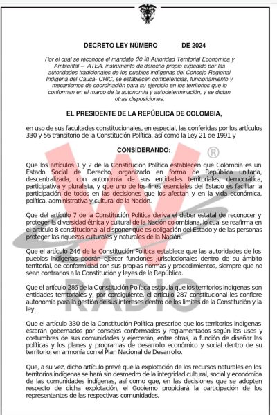 Este decreto, revelado en exclusiva por La W, busca asegurar la autonomía de las comunidades indígenas y fortalecer la protección de sus resguardos y reservas.