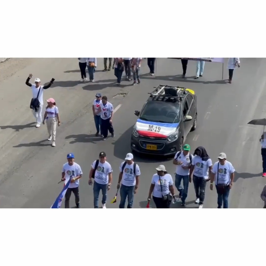 Pues en las movilizaciones que se llevan a cabo el día de hoy miércoles, 1 de mayo, se puede observar dicha bandera con frases alusivas al M-19, junto a mensajes a favor del pueblo de Palestina, y otros en contra de la ofensa de Israel.