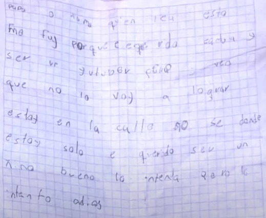 Con una extraña carta, David dejó un último mensaje a sus padres antes de huir: “Papá o mamá, quien lea esto. Me fui porque he querido (…) y ser un youtuber, pero veo que no lo voy a lograr. Estoy en la calle, no sé dónde. Estoy solo, he querido ser un niño bueno, lo intento, pero lo intento. Adiós”.
