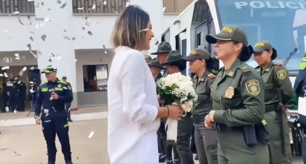 Con un ramo de flores y anillo, la sorprendió en una estación de policía, delante de sus compañeros en Bogotá. pic.twitter.com/pIRvACllBB
