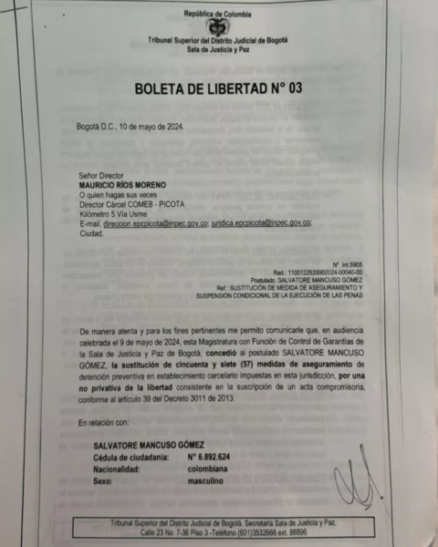 En la misiva se puede leer: “De manera atenta y para los fines pertinentes me permito comunicarle que, en audiencia celebrada el 9 de mayo de 2024, esta Magistratura con Función de Control de Garantías de la Sala de Justicia y Paz de Bogotá, concedió al postulado SALVATORE MANCUSO GÓMEZ, la sustitución de cincuenta y siete (57) medidas de aseguramiento de detención preventiva en establecimiento carcelario impuestas en esta jurisdicción, por una no privativa de la libertad consistente en la suscripción de un acta compromisoria, conforme al artículo 39 del Decreto 3011 de 2013”.