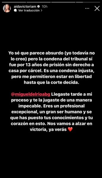 Además de eso, Aida Victoria afirmó que cree en la justicia y señaló que no se rendirá: «Seguimos creyendo en la justicia y vamos a dar la pelea hasta el final», concluyó.