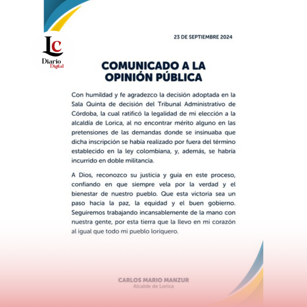 Esta decisión reafirma la confianza en el sistema electoral y en la legalidad del proceso que llevó a Carlos Mario Manzur a la alcaldía de Loríca.