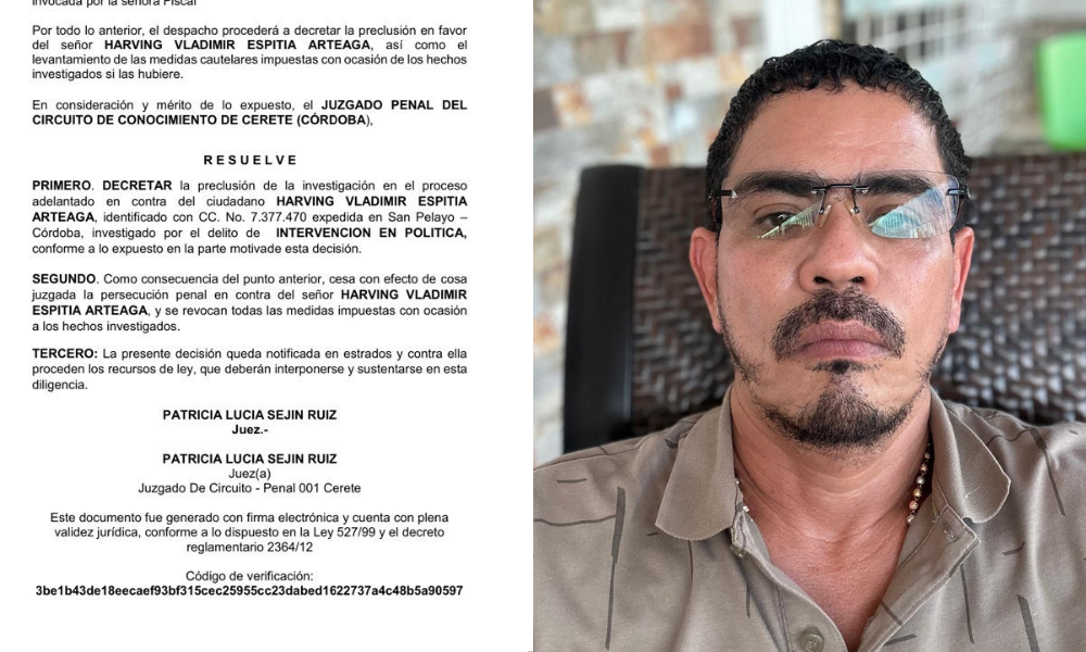 El juzgado penal del circuito de Cereté decretó la preclusión solicitada por la Fiscalía General de la Nación en la investigación contra el exalcalde de San Pelayo, Harving Vladimir Espitia Arteaga.