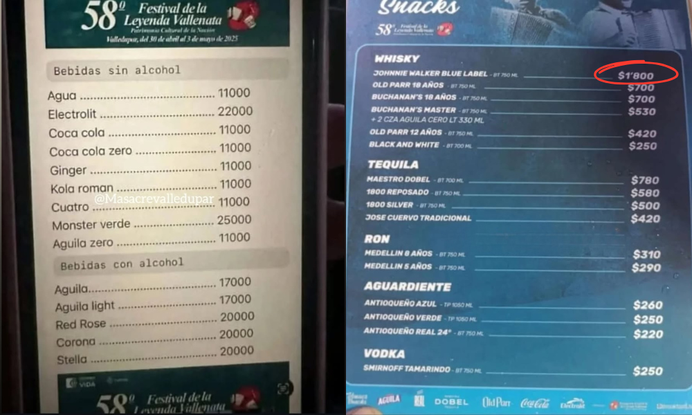 Sin embargo, en la jornada de ayer, en el Parque de la Leyenda Vallenata, donde se llevó a cabo la final para coronar al rey vallenato y se presentaron artistas como Pepe Aguilar y Gilberto Santa Rosa, surgió una queja recurrente entre los asistentes: los elevados precios de los licores y bebidas. En una imagen que circula en redes, se puede ver que una botella de agua alcanza un precio de hasta 11.000 pesos, mientras que una botella de whisky llega a costar casi 2 millones de pesos.