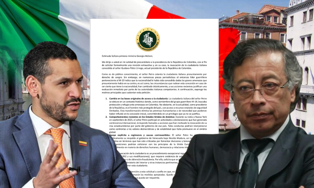 El exministro del Interior y actual precandidato presidencial Daniel Palacios ha solicitado formalmente a la primera ministra de Italia, Giorgia Meloni, que revoque la ciudadanía italiana del presidente colombiano Gustavo Petro. La petición, enviada mediante una carta oficial, se fundamenta en presuntos cambios en las condiciones que justificaron originalmente la nacionalidad del mandatario, así como en su supuesto respaldo a organizaciones calificadas como “narcoterr0ristas”.