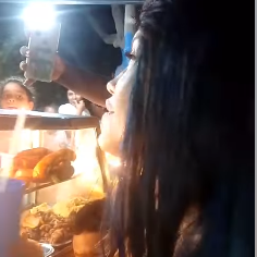 Las personas, al ver su peculiar forma de ser, aprovecharon el momento y le pidieron canciones, ella, ni corta ni perezosa les brindó su show a orillas de la calle y con un frito entre las manos.