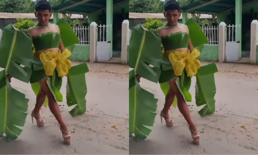 Un video que circula en redes sociales ha causado sensación entre los internautas: un joven decidió vestirse con hojas de plátano y una flor amarilla improvisada como parte de un llamativo “traje de gala”. Con tacones incluidos y música decembrina de fondo, el clip rápidamente se volvió viral, desatando comentarios y risas.