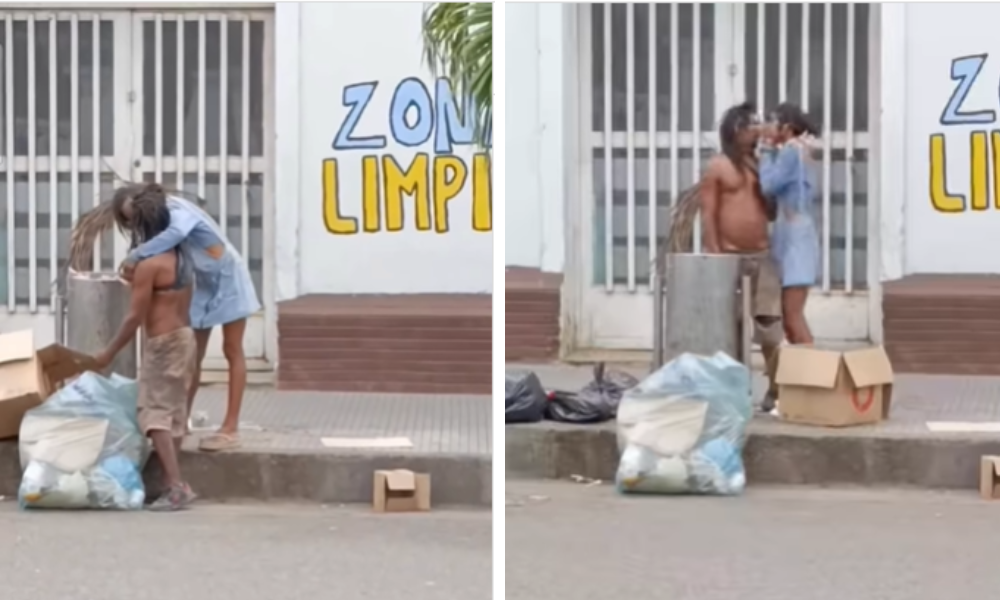 En redes sociales se volvió viral un video que muestra a una pareja en condición de calle compartiendo un momento de cariño mientras trabajan en reciclaje. El hombre y la mujer, que al parecer mantienen una relación sentimental, se dan besos en la boca en repetidas ocasiones, dejando ver que, pese a las dificultades de su día a día, también tienen derecho a disfrutar del amor y la compañía.