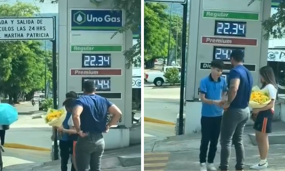 Una escena cotidiana se volvió viral en redes sociales, luego de que se compartiera la imagen de un padre acompañando a su hija mientras recibía un ramo de flores de parte de un joven que está enamorado de ella. El momento ocurrió en una estación de gasolina y fue captado justo cuando la joven sostenía el ramo de flores amarillas, mientras su padre observaba con serenidad y el muchacho se mostraba visiblemente nervioso.