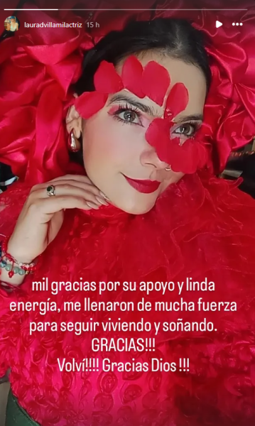 Lejos del entorno hospitalario, Laura Villamil compartió un mensaje de agradecimiento en su cuenta de Instagram: «Mil gracias por su apoyo y linda energía, me llenaron de mucha fuerza para seguir viviendo y soñando. ¡Gracias! ¡Volví! ¡Gracias, Dios!».