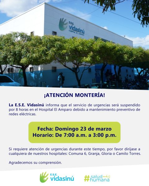 La E.S.E. Vidasinú informó a la comunidad de Montería que el servicio de urgencias del Hospital El Amparo estará suspendido por un periodo de 8 horas debido a labores de mantenimiento preventivo en las redes eléctricas del centro hospitalario.