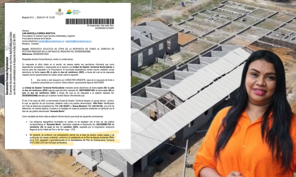 La Agencia Nacional de Tierras (ANT) confirmó que el predio identificado con matrícula inmobiliaria No. 140-183307, donde se adelanta el proyecto habitacional Villa Petro, no se encuentra dentro del polígono delimitado como bien de uso público correspondiente al Humedal Berlín. Esta aclaración se dio en respuesta a solicitudes de la representante legal de ASOVIDECOR, Yalenis Mazón, y se sustenta en resoluciones ejecutoriadas y visitas técnicas realizadas por la Unidad de Gestión Territorial NorOccidente. Según la ANT, el predio no fue vinculado al procedimiento de deslinde agrario, por lo que no fue objeto de análisis ni afectación directa.