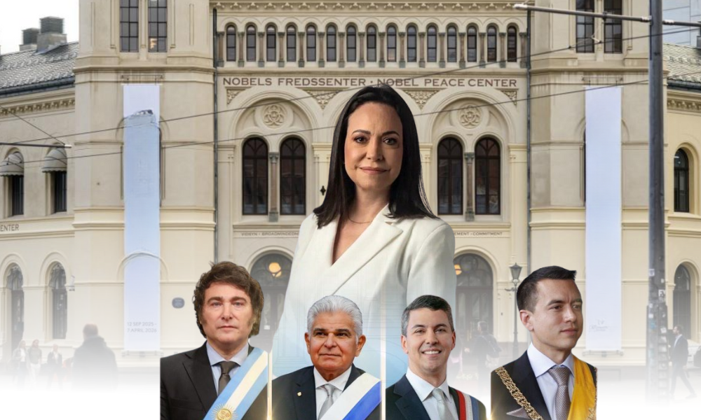 La líder opositora venezolana María Corina Machado recibirá el Premio Nobel de la Paz 2025 en Oslo, Noruega, en reconocimiento a su lucha por los derechos democráticos del pueblo venezolano. En un hecho sin precedentes, cuatro presidentes latinoamericanos, José Raúl Mulino (Panamá), Daniel Noboa (Ecuador), Santiago Peña (Paraguay) y Javier Milei (Argentina) asistirán a la ceremonia para respaldar públicamente su causa.