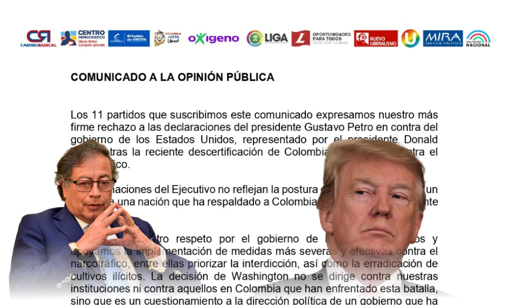 Un bloque de once partidos políticos, que incluye a colectividades de oposición y de centro derecha, cuestionó de manera directa la postura del presidente Gustavo Petro frente a la reciente descertificación de Colombia en la lucha contra el narcotráfico por parte de Estados Unidos.