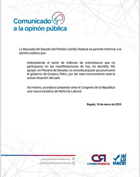 El exvicepresidente Germán Vargas Lleras, junto con la bancada del Partido Cambio Radical, anunció su decisión de votar en contra de la consulta popular propuesta por el Gobierno Nacional para abordar las reformas sociales.