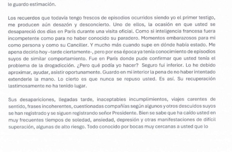 En el documento, Leyva también señala que las conductas del mandatario, como llegadas tarde, incumplimientos y frases incoherentes, han sido recurrentes y están relacionadas con la adicción que mencionó antes.