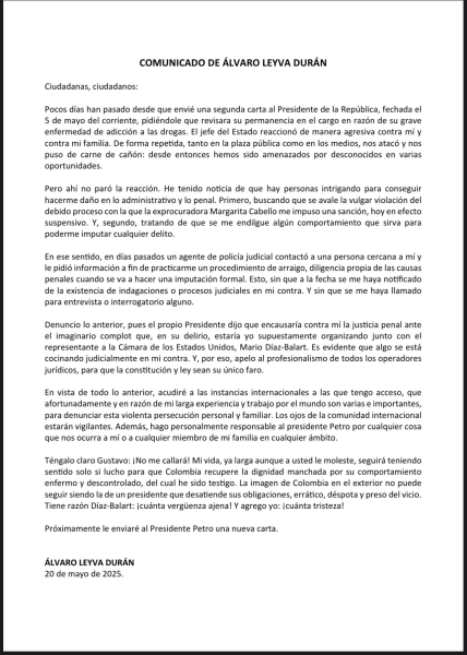 Leyva advirtió que acudirá a instancias internacionales para denunciar lo que considera una estrategia para silenciarlo, responsabilizando directamente a Petro por cualquier daño que pueda sufrir él o su familia. Con un tono desafiante, el exministro aseguró que no se callará y que seguirá exponiendo lo que, según él, es el deterioro del Gobierno.