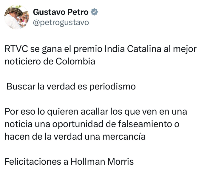 En su cuenta de X, el mandatario afirmó que el noticiero público había sido reconocido como el “mejor noticiero de Colombia” en los Premios India Catalina. Sin embargo, la realidad es que el título de “Mejor noticiero” fue para Noticias Caracol.