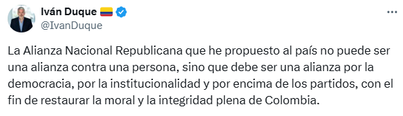 El expresidente Iván Duque ha planteado la creación de una Alianza Nacional Republicana, una iniciativa que, según él, debe trascender los partidos políticos y enfocarse en la defensa de la democracia, la institucionalidad y la restauración de la moral en Colombia. A través de su cuenta de X, Duque enfatizó que esta alianza no debe ser una postura contra una persona, sino un esfuerzo colectivo por el bienestar del país.