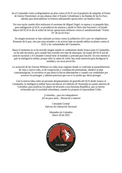 En el documento, el ELN denuncia la existencia de un «plan contrainsurgente» y señala la falta de continuidad en los diálogos con las diferentes administraciones del gobierno.