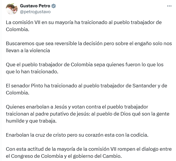 Petro dirigió críticas específicas al senador Miguel Ángel Pinto, a quien acusó de traicionar a los trabajadores de Santander y del país. Además, el presidente cuestionó a quienes, según él, utilizan símbolos religiosos mientras toman decisiones que perjudican a la población humilde y trabajadora. “Enarbolan la cruz de Cristo, pero su corazón está con la codicia”, afirmó en su publicación.