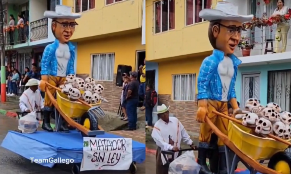 En el clip compartido por el jefe de Estado, se observa una carroza con la figura del expresidente Álvaro Uribe, quien aparece empujando una carretilla llena de calaveras y huesos, con una frase que dice “Matador sin ley”.