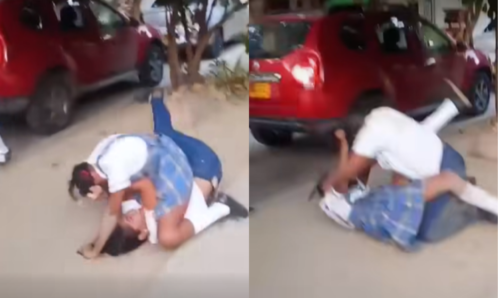Las imágenes muestran una pelea entre dos adolescentes, al parecer, a las afueras de la Institución Educativa Distrital Laura Vicuña, en Santa Marta, un acto que ha sido ampliamente condenado por padres de familia, docentes y ciudadanos.