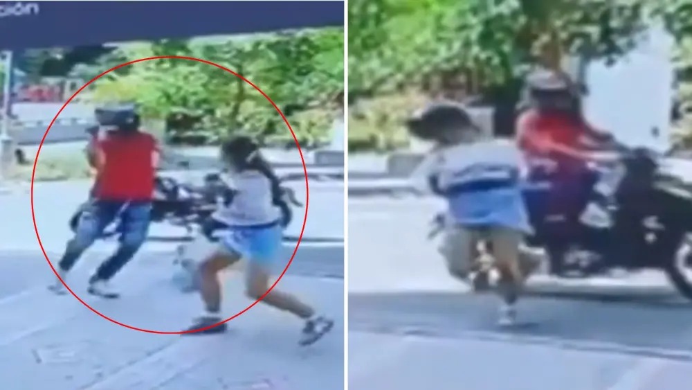 Las cámaras de seguridad captaron el momento en el que la mujer caminaba por un andén, cuando un motorizado de camisa roja se bajó del vehículo para intentar quitarle el celular.