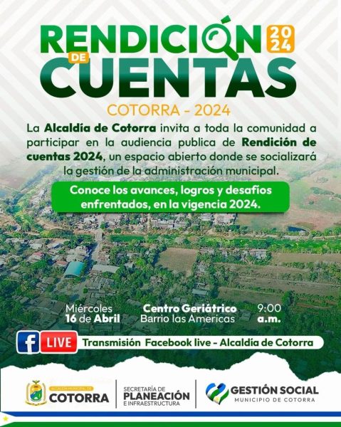La Alcaldía de Cotorra, liderada por María Eugenia López, extiende una invitación a toda la comunidad para participar en la audiencia pública de rendición de cuentas 2024, un espacio de diálogo abierto donde se presentarán los avances, logros y desafíos de la gestión municipal durante la vigencia de este año.