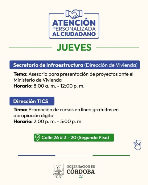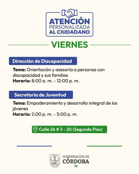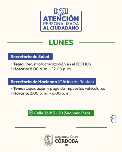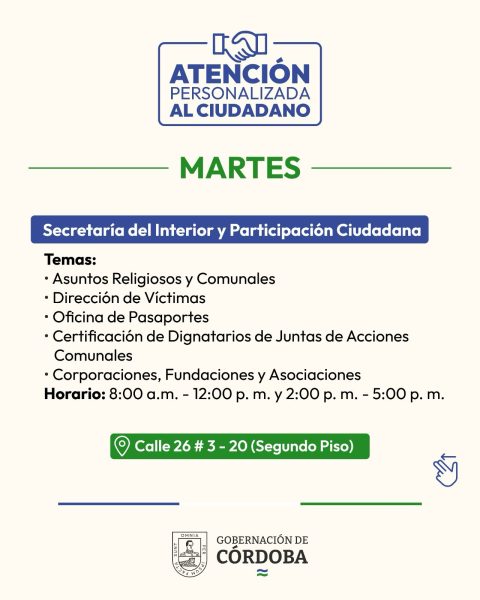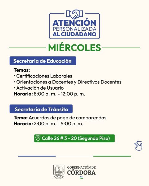 Con el objetivo de fortalecer la relación con la ciudadanía y garantizar un servicio eficiente y de calidad, la Gobernación de Córdoba presenta su nueva agenda de atención presencial y personalizada. Esta estrategia permitirá a los ciudadanos acceder directamente a los servicios de las secretarías y dependencias del gobierno departamental, en horarios específicos, asegurando una atención oportuna y cercana.