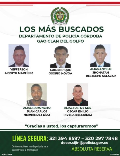 El Departamento de Policía Córdoba ha dado a conocer un volante con los cinco hombres más buscados del departamento, en un esfuerzo por combatir el crimen y garantizar la seguridad de la comunidad.