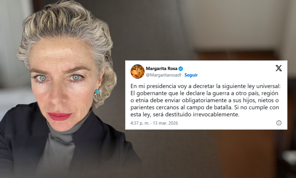 La actriz y activista Margarita Rosa de Francisco desató una tormenta en redes sociales con un tuit explosivo desde su cuenta de X, donde propone una «ley universal» drástica: todo gobernante que declare la guerra a otro país, región o etnia debe enviar obligatoriamente a sus hijos, nietos o parientes cercanos al frente de batalla. Si no cumple, sería destituido de inmediato e irrevocablemente. Esta idea, lanzada como si ella misma fuera presidenta, ha generado un debate furioso, con miles de reacciones que van desde aplausos hasta burlas.