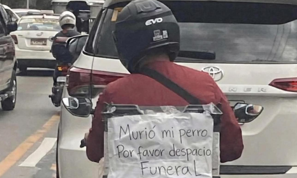 En medio de las congestionadas calles y el bullicio del tráfico, un hombre avanzaba a paso lento, captando la atención de conductores y peatones. No era el caos vial ni el miedo lo que lo detenía, sino el profundo respeto hacia su compañero de vida: su perro, que había fallecido recientemente. Sobre la moto, un cartel escrito a mano rezaba con sencillez devastadora: “Murió mi perro. Por favor despacio. Funeral”.