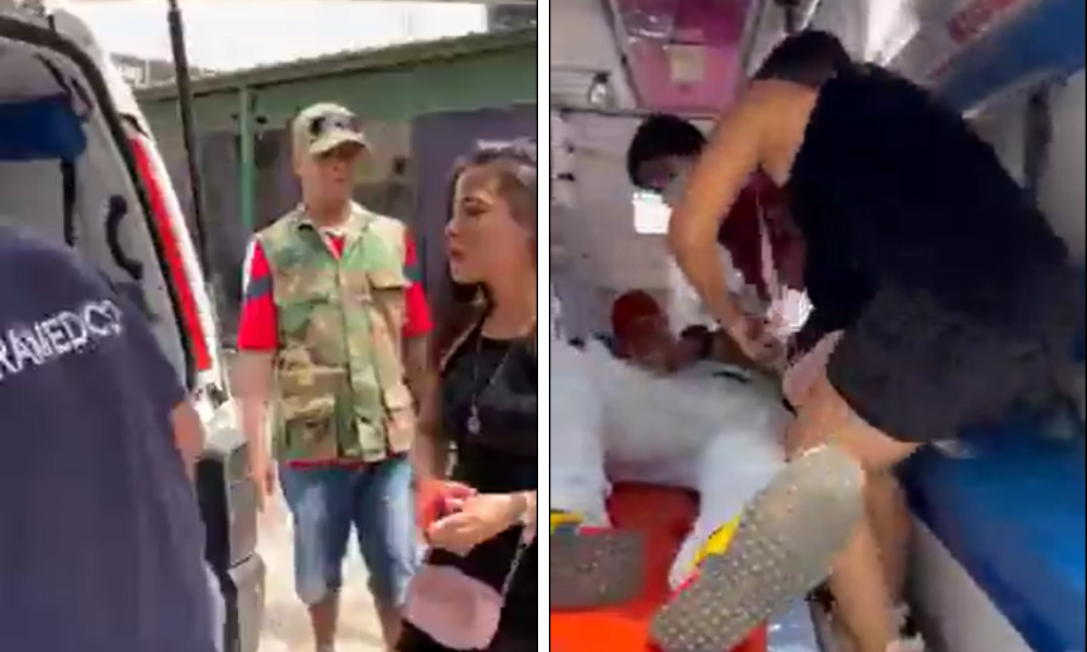El momento generó tensión entre los presentes, ya que la mujer, visiblemente alterada, no quiso bajarse del vehículo hasta que intervino personal de seguridad. Según se aprecia en el video, tras descender de la ambulancia continuó reclamándole a su pareja y reaccionó de forma impulsiva, lo que llevó a que fuera retenida por las autoridades en el lugar. Mientras tanto, el hombre herido pudo ser trasladado para recibir atención médica.