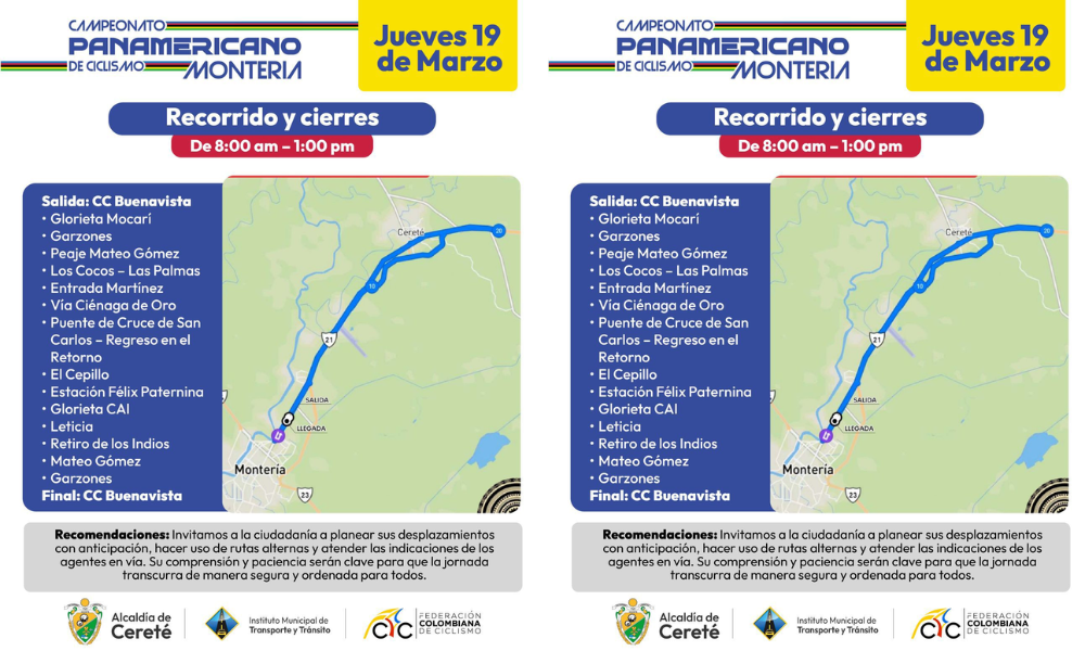 En el marco del Campeonato Panamericano de Ciclismo de Ruta, las autoridades de tránsito de Cereté informan que este jueves 19 de marzo se implementarán cierres viales temporales entre las 8:00 a. m. y la 1:00 p. m., debido al paso de la competencia por importantes corredores del municipio y sus alrededores.