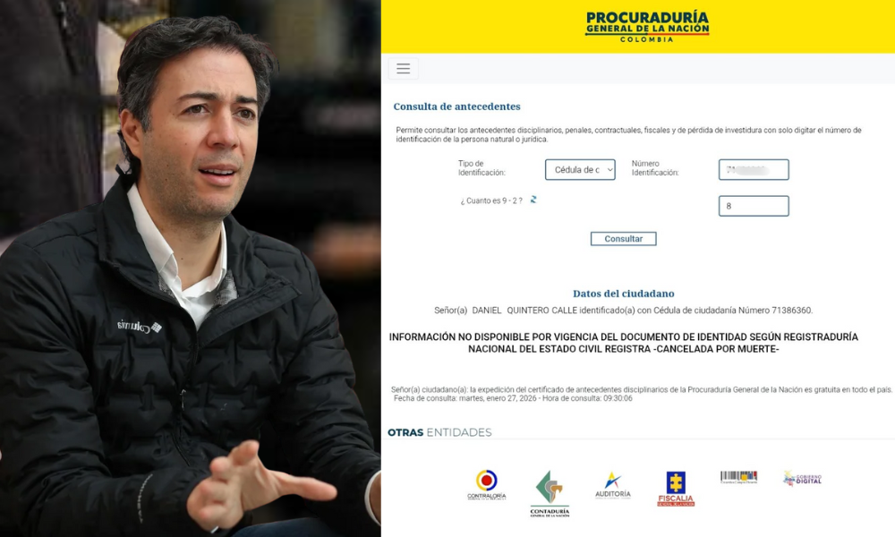 Un hecho insólito ocurrió el miércoles cuando el sistema de información de la Procuraduría General de la Nación reportó como “cancelada por muerte” la cédula del exalcalde de Medellín, Daniel Quintero, quien en los próximos días enfrentará un juicio de imputación. El hallazgo se produjo durante una consulta rutinaria de antecedentes disciplinarios, generando un escándalo institucional inmediato.